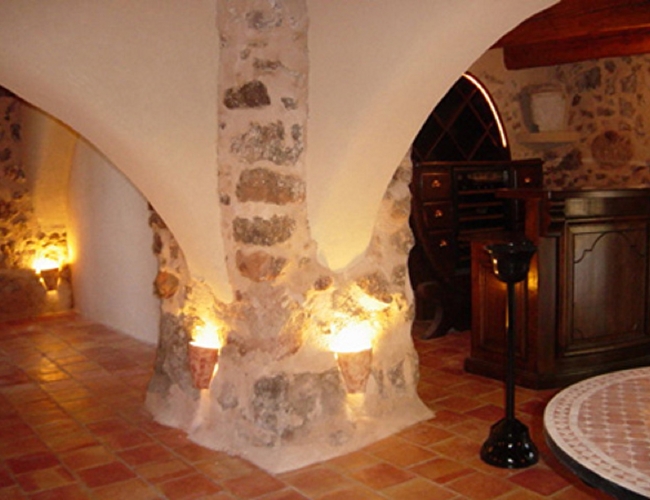 La cave est semi-enterrée, construite en pierres naturelles, avec un plafond typique en ‘voutains’.