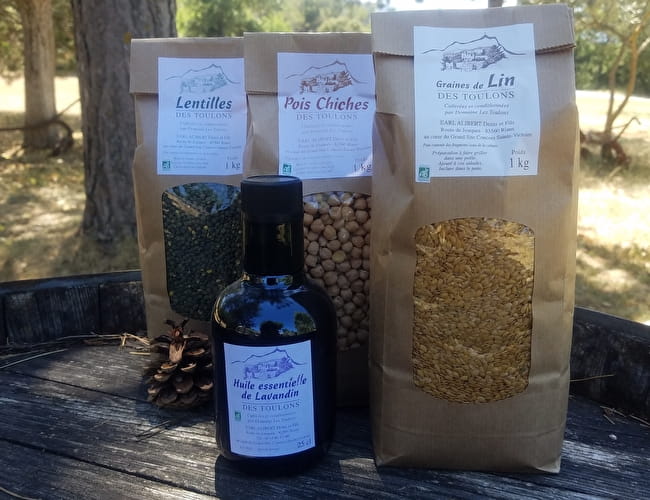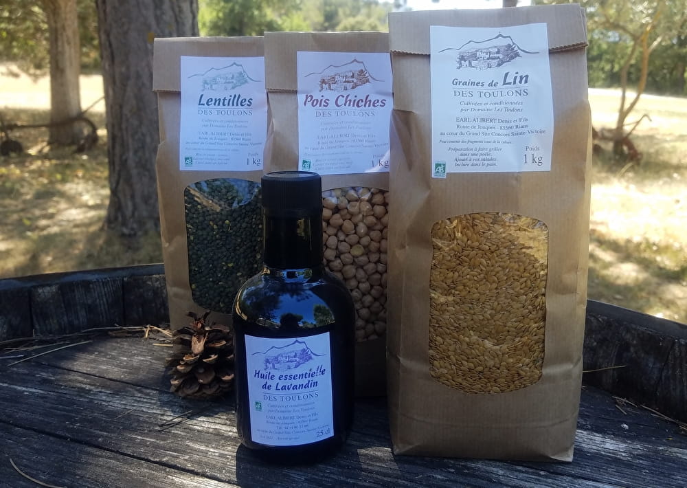 Production of wines, beer, cereals, various (flax, lentils, chickpeas...), lavender essential oil and extra virgin olive oil.