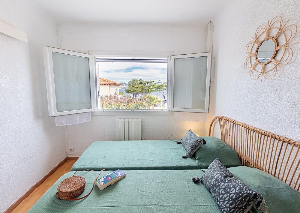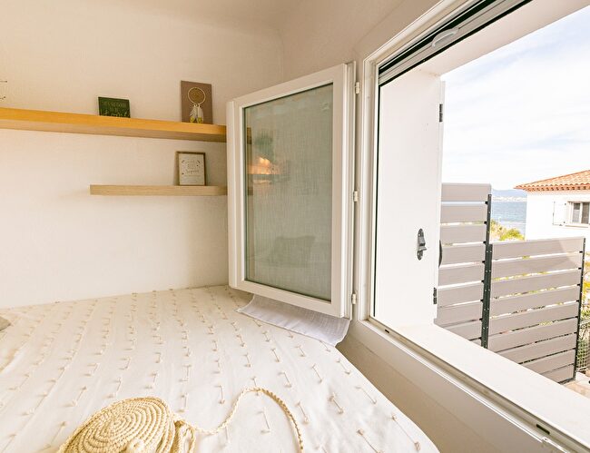 Deux terrasses, exposées Sud et Nord avec une belle vue mer, coin repas, plancha et salon de jardin. Une machine à laver collective. 1 place de parking à disposition.
