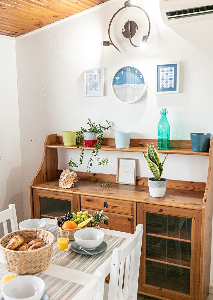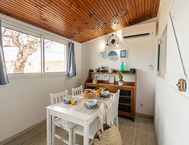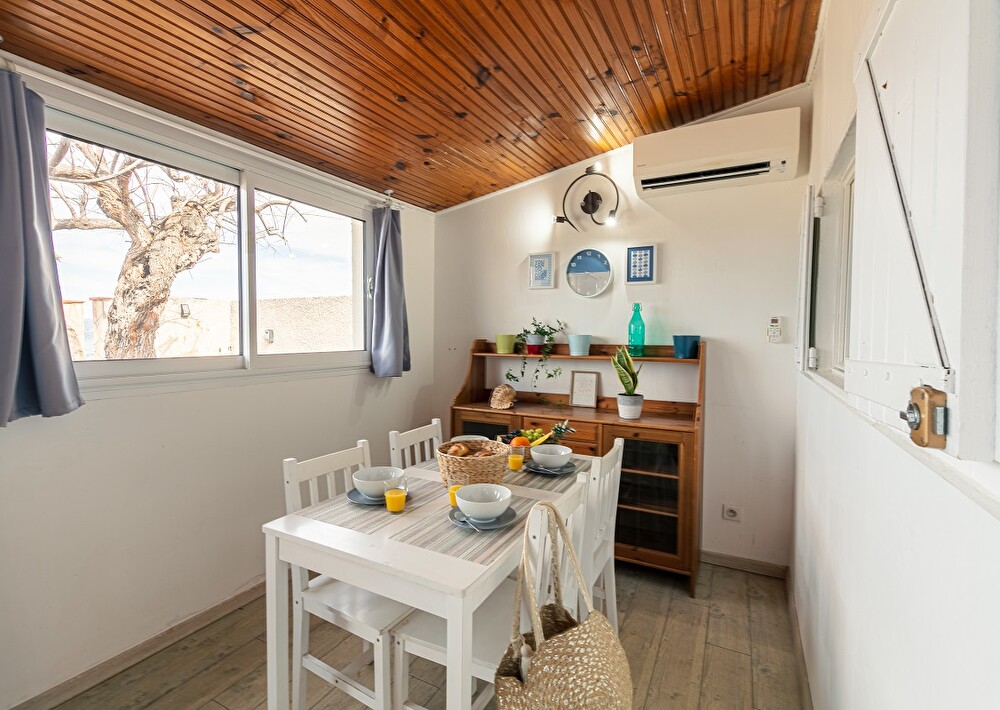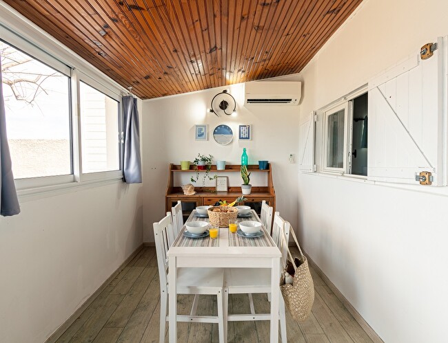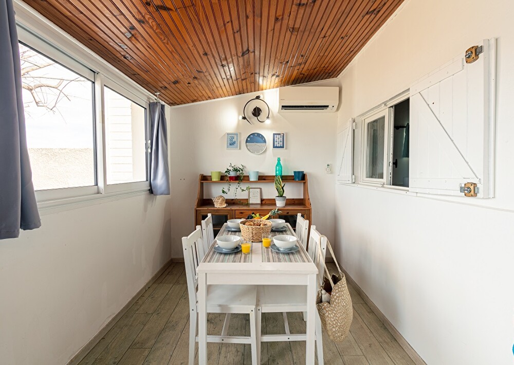 Terrace with dining area, griddle and 2 sun loungers. Outdoor toilet and shower. The washing machine is located in an outdoor room at the entrance to the accommodation.