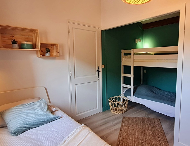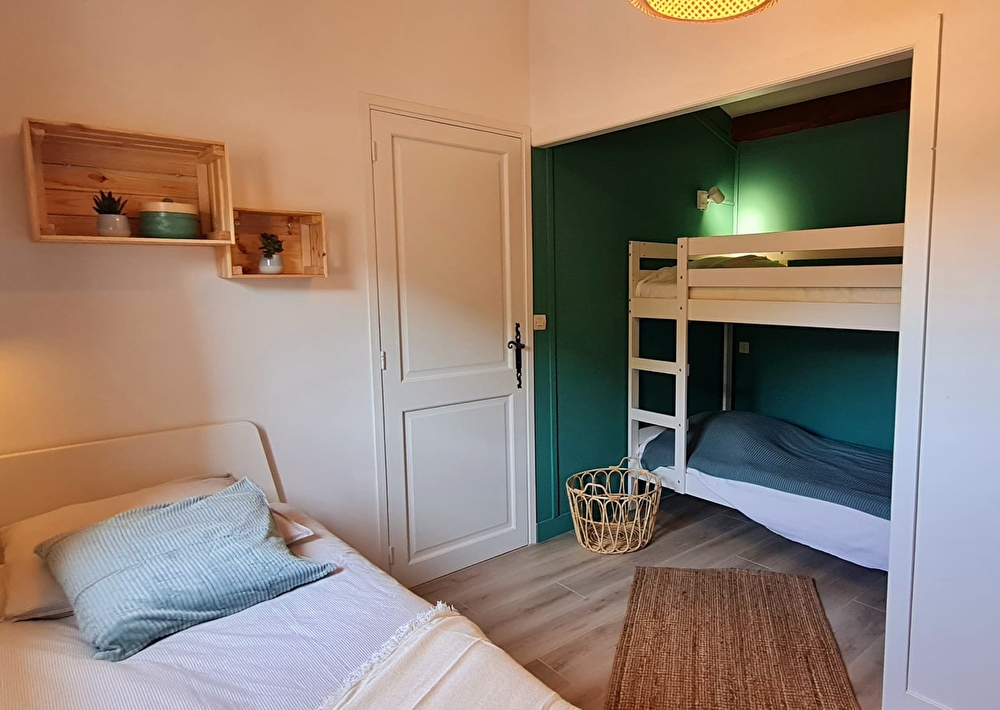 La cuisine ouverte, entièrement équipée, s’intègre parfaitement au grand salon, offrant un espace de vie propice aux moments partagés. Le salon dispose également d'un canapé-lit pour 2 personnes. L’appartement comprend deux chambres avec respectivement un lit double (160x200), ainsi qu'une chambre traversante équipée d'un lit simple (90x200) et d'un lit superposé (2 x 80x200), parfait pour les enfants ou les jeunes.