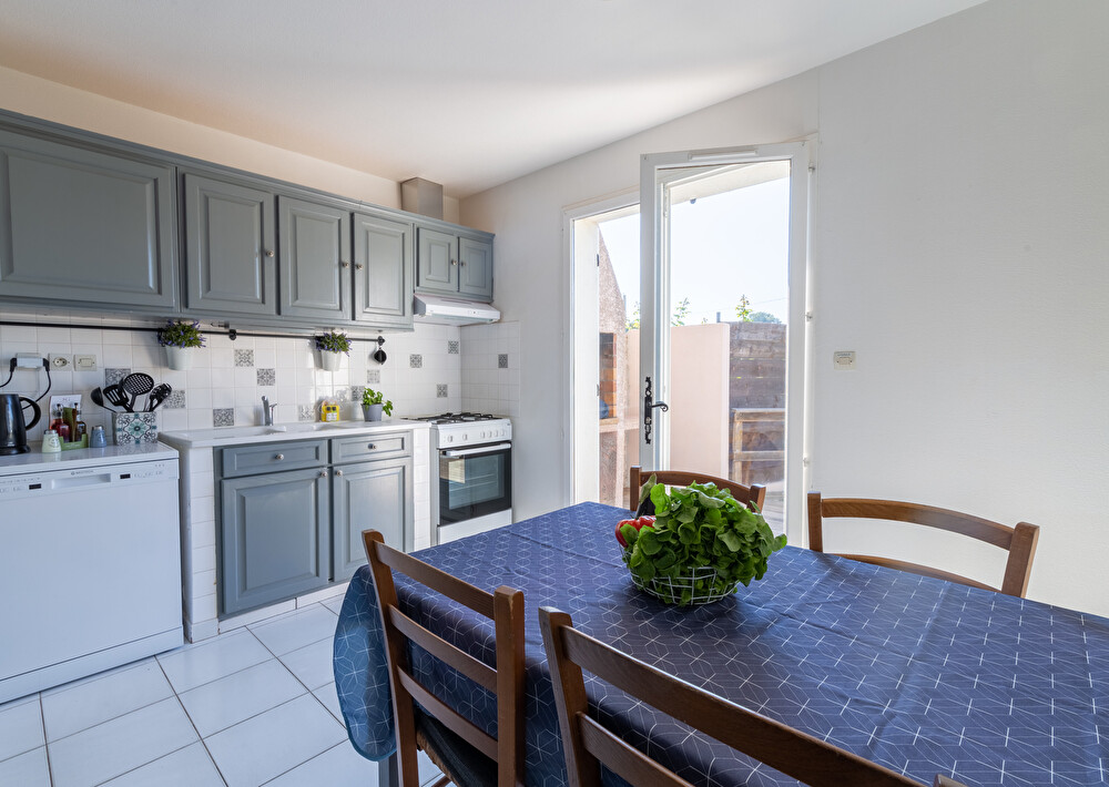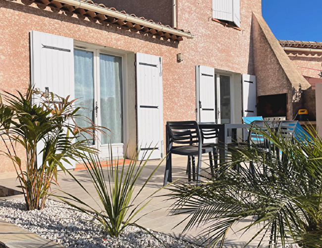Grand jardin de 200m2 entièrement clos avec coin repas et coin plancha, 2 transats.