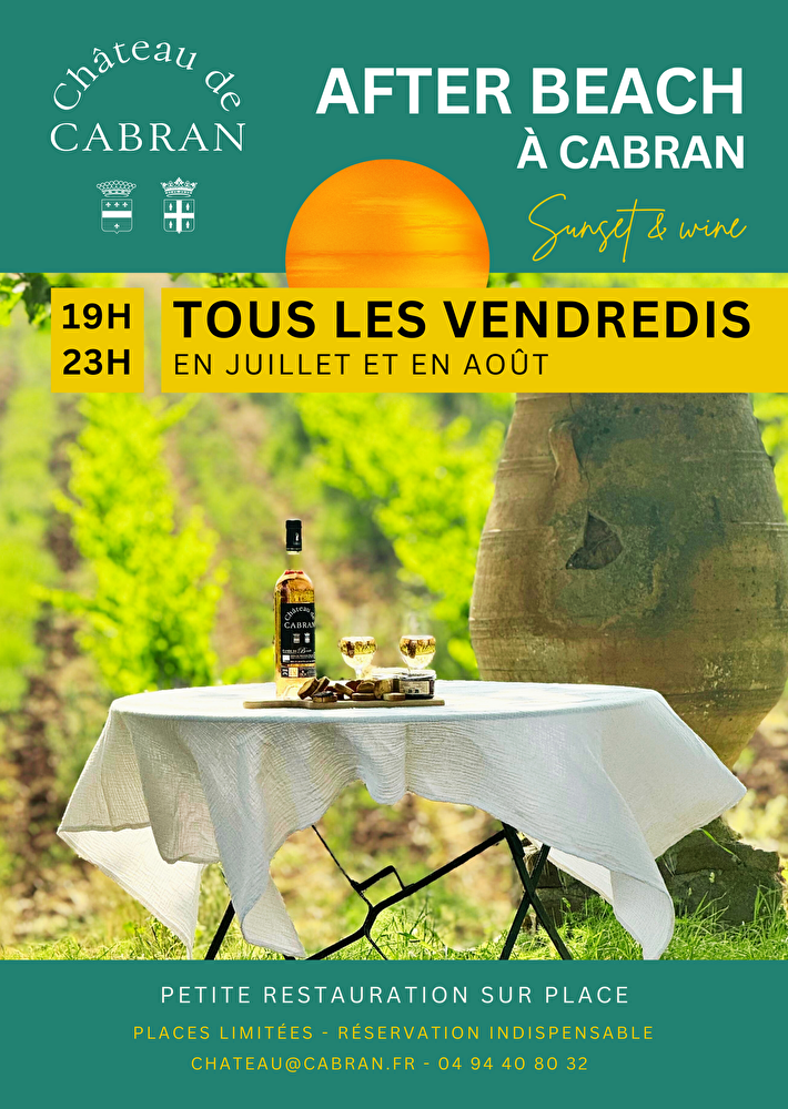 This year again, Château de Cabran is partnering with "The Grill Show" to offer you even more convivial and delicious "After Beach" evenings! Once a week in July and August, starting at 7 pm, our team welcomes you amidst the vineyards and invites you to taste our finest vintages of Côtes de Provence and Fréjus AOC wines, by the glass or bottle. Enjoy live music and quality food on site (from the organizer of the French Barbecue Championship!).