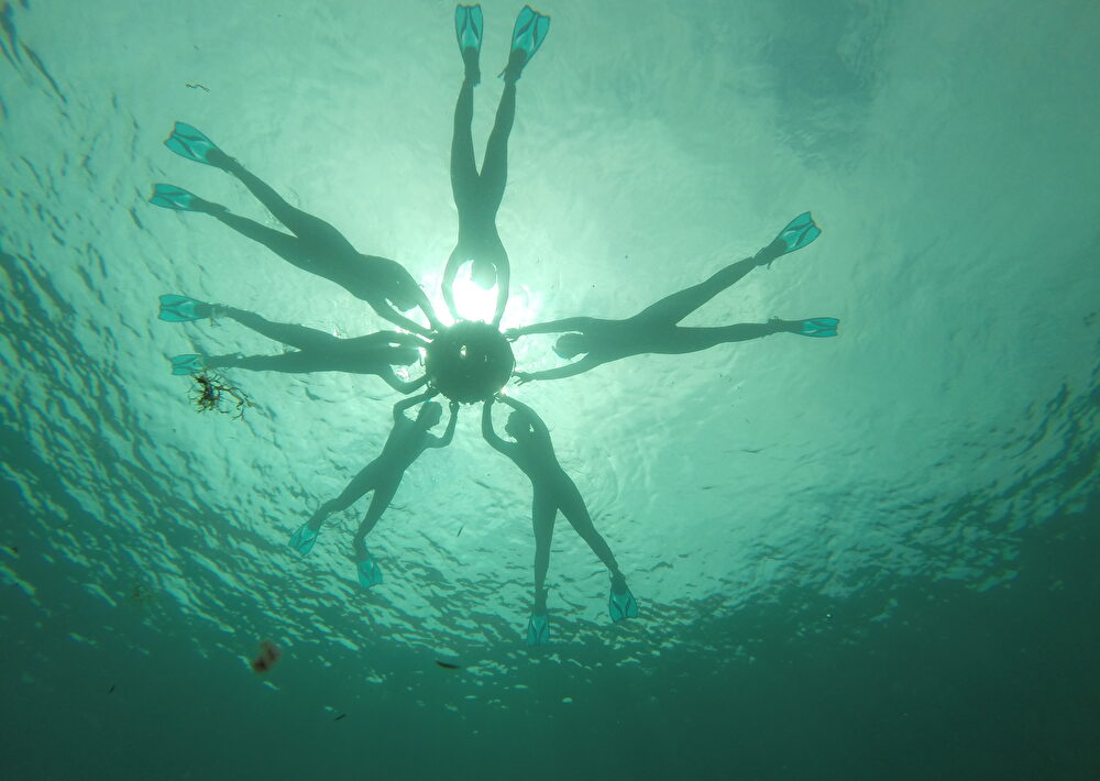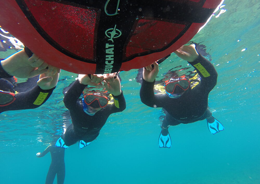 Randonnée palmée de découverte des petits fonds de la Méditerranée. Les participants évoluent par groupe de huit accompagnés par un moniteur diplômé d'état, formé spécifiquement. Avec un éco-guide de la mer, ils s'initient (si besoin) à l'utilisation du matériel (palme, masque, tuba et combinaison) puis partent à la rencontre sensorielle (visuelle, tactile...) des espèces et milieux de la Calanque de Port d'Alon. Au-delà des connaissances sur la biodiversité, des notions de respect de la nature et d'évolution des comportements sont transmises lors de cette activité.