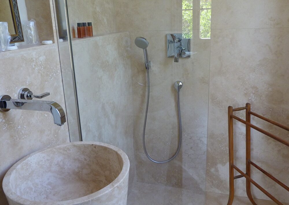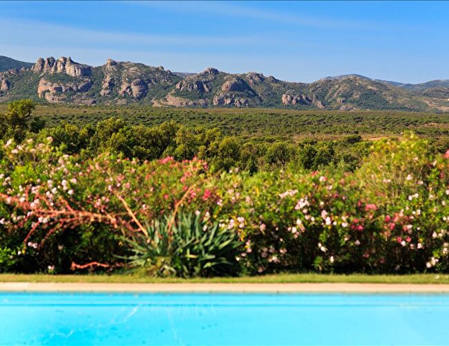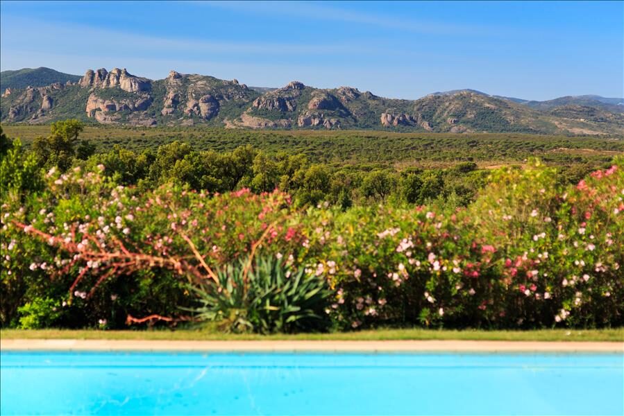 Un peu à l’écart, la piscine en plein air offre une vue magnifique sur le rocher de Roquebrune sur Argens, site classé.