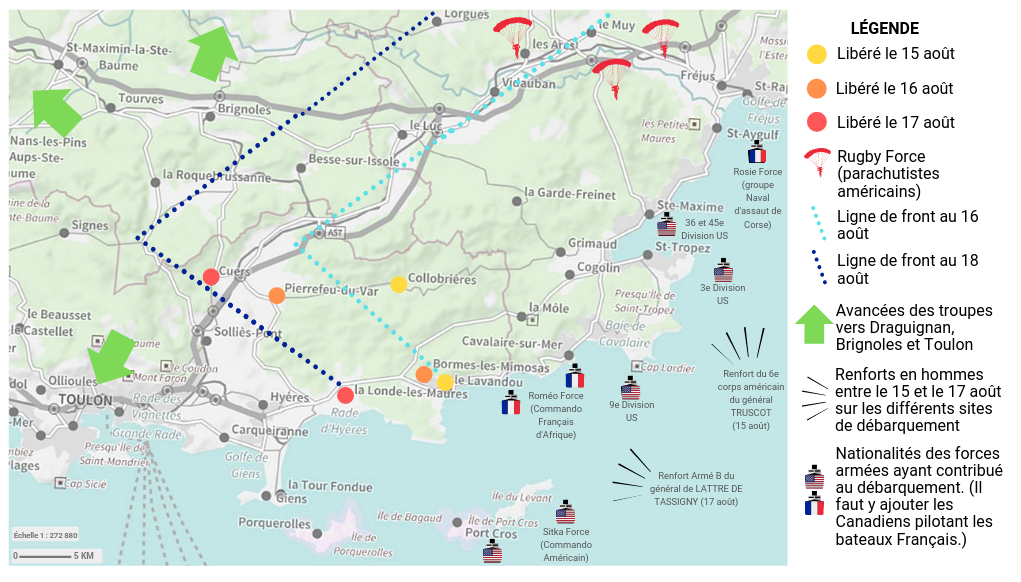 Au matin du 15 août, les divisions américaines débarquent à Cavalaire ; pendant huit jours, toutes celles de l’Armée d’Afrique débarquent à flux continu sur les plages de Cavalaire, le Dramont, la Nartelle pour libérer les villes et villages varois occupés.