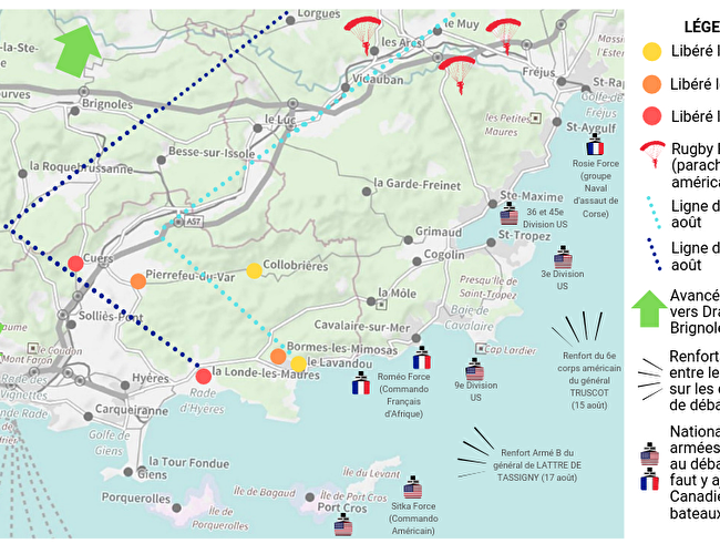 Deux mois après le débarquement de Normandie, le 6 juin 1944, les Alliés reçoivent le feu vert. Dans la nuit du 14 au 15 août 1944, les commandos d’Afrique, premiers soldats français sur le sol de Provence, prennent d’assaut le Cap Nègre, le groupe naval d’assaut, la pointe de l’Esquirol, les Canadiens et les rangers Américains, les Îles d’Or. Les parachutistes américains sont largués dans la plaine du Muy.
