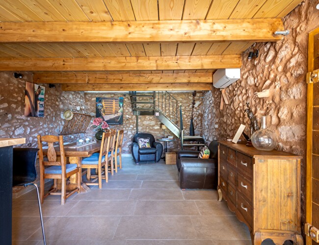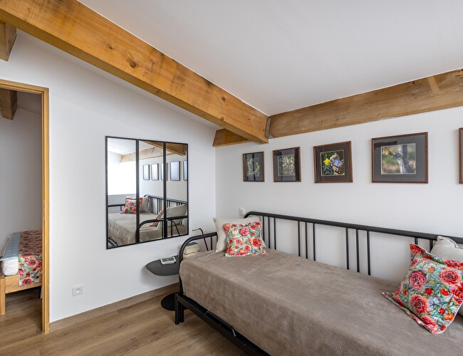 A l'étage un espace détente pouvant servir d'espace nuit avec sa banquette-lit modulable en 1 lit simple 80x200 cm ou 1 lit double 160x200 cm, une chambre climatisée avec un lit double en 160x200 cm, salle d'eau avec wc. Dans un but éco responsable, le vigneron vous laisse un accès privilégié à la machine à laver qui se trouve au domaine à 900m environ. Vous pourrez par la même occasion en profiter pour vous détendre, déguster sa production et parler de sa technique.