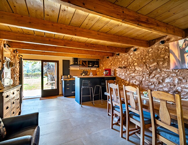A l'extérieur, un jardin privatif clôturé en ganivelle offrant une vue 360° sur les vignes et la nature, emplacement de stationnement et prise pour véhicule électrique.