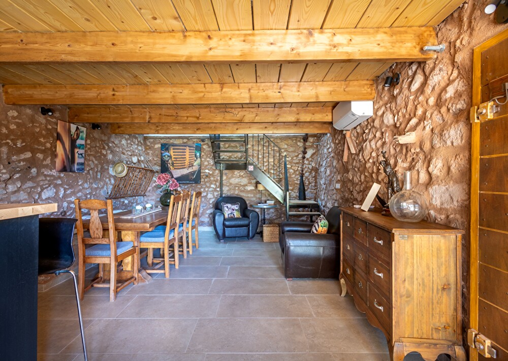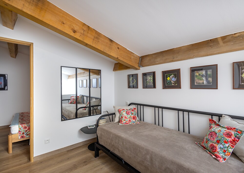 A l'étage un espace détente pouvant servir d'espace nuit avec sa banquette-lit modulable en 1 lit simple 80x200 cm ou 1 lit double 160x200 cm, une chambre climatisée avec un lit double en 160x200 cm, salle d'eau avec wc. Dans un but éco responsable, le vigneron vous laisse un accès privilégié à la machine à laver qui se trouve au domaine à 900m environ. Vous pourrez par la même occasion en profiter pour vous détendre, déguster sa production et parler de sa technique.