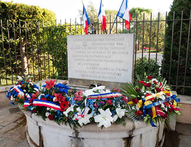 « LA PREMIERE ARMEE FRANCAISE COMMANDEE PAR LE GENERAL DE LATTRE DE TASSIGNY, FORGEE EN AFRIQUE ET EN ITALIE, DEBARQUEE EN PROVENCE, GROSSIE DES FORCES FRANCAISES DE L’INTERIEUR, A LIBERE CUERS, LE 17 AOUT 1944, DANS SA MARCHE VICTORIEUSE AU RHIN ET DANUBE »