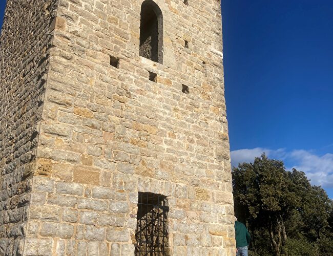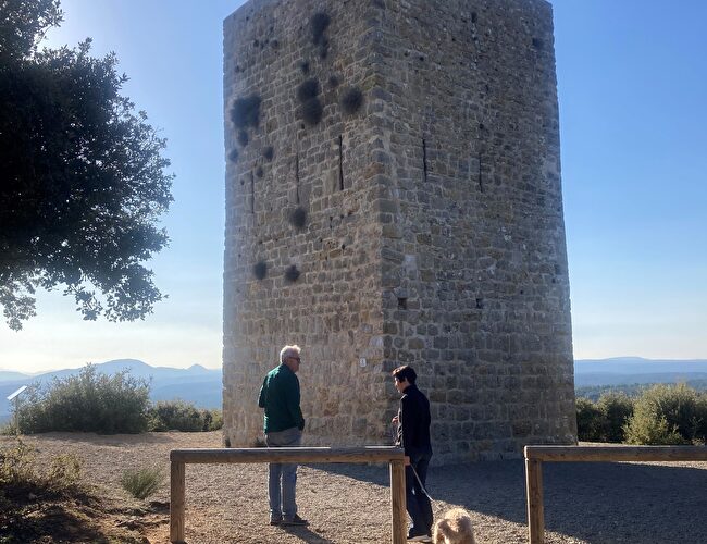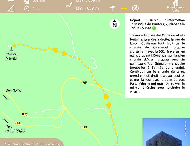 Traverser la place des Ormeaux et à la fontaine, prendre à droite, la rue du Lavoir. Continuer tout droit sur le chemin de Chavardet jusqu’au croisement avec la D51. Traverser en étant prudent ! Continuer sur l’ancien chemin d’Aups jusqu’au prochain panneau « Tour Grimaldi » à gauche (poubelles à l’entrée du chemin). Continuer sur le chemin de terre, prendre tout droit jusqu’au bout et gagner Tour avec le point de vue. Puis, faire demi-tour et suivre le même itinéraire pour rejoindre le village.