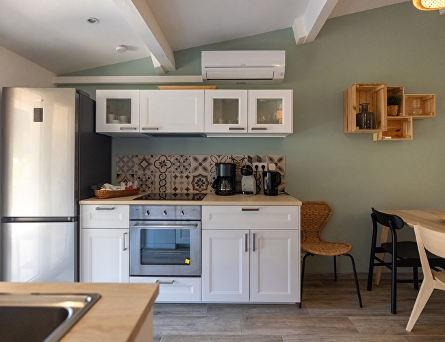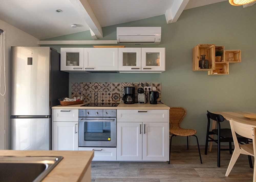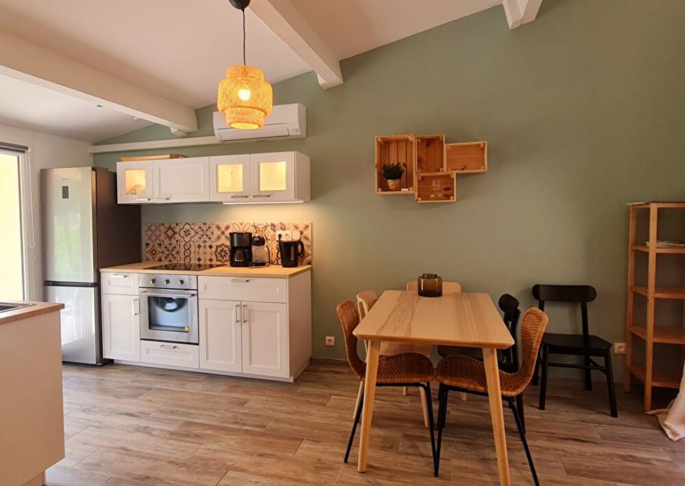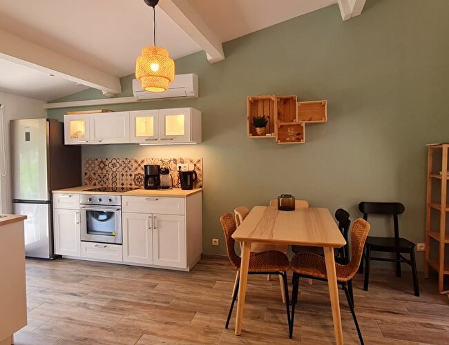 La pièce principale lumineuse regroupe une cuisine ouverte bien équipée, un salon et une salle à manger conviviale, complétés par un canapé-lit pour un couchage supplémentaire. L’espace nuit comprend une chambre avec un lit double (160x200) et une seconde chambre dotée d’un lit gigogne (2 x 80x200), parfait pour les enfants.