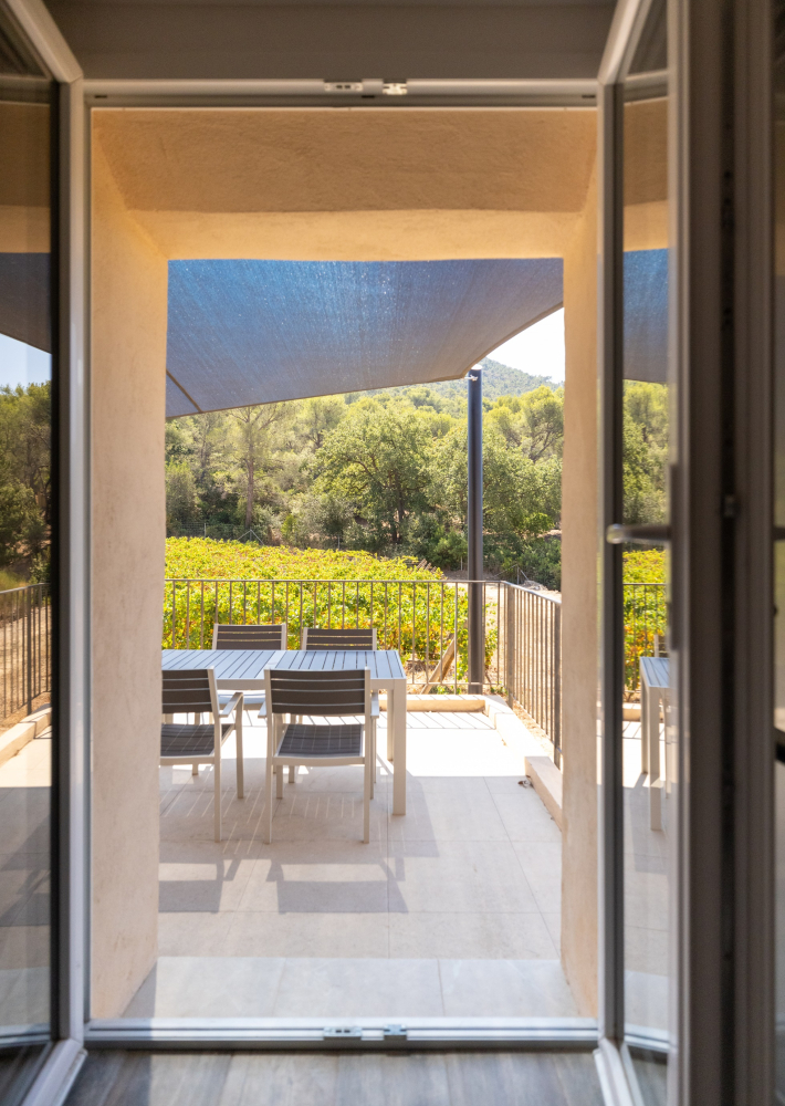 À l’extérieur, une grande terrasse vous invite à profiter d’une vue imprenable sur la mer et les vignes, un cadre idyllique pour savourer vos repas ou simplement vous détendre en pleine nature.