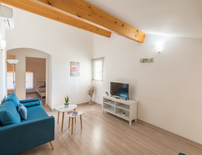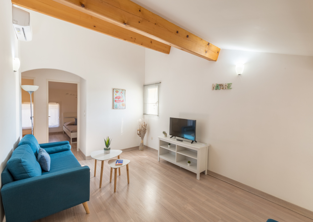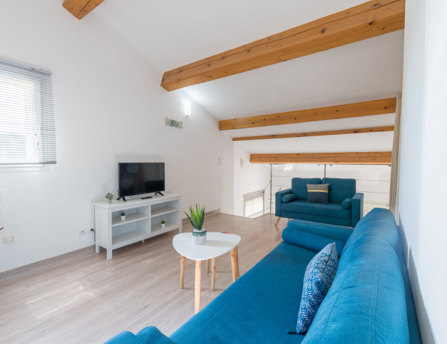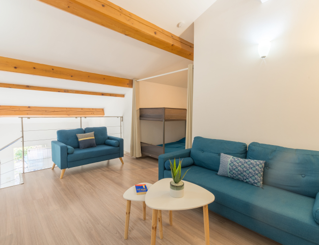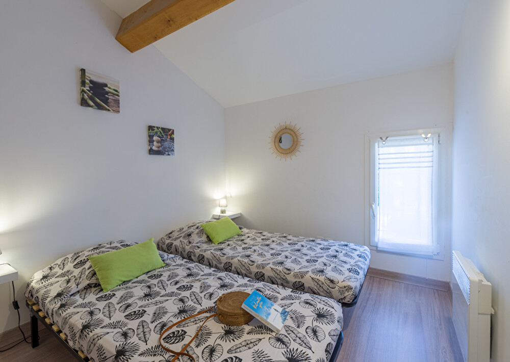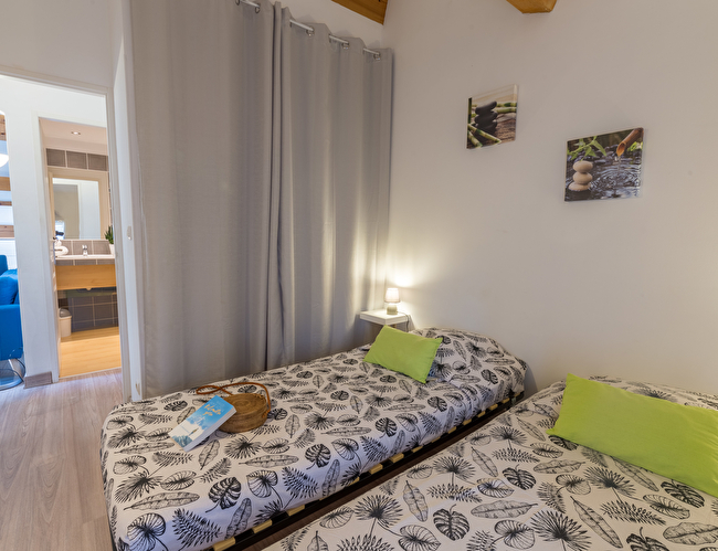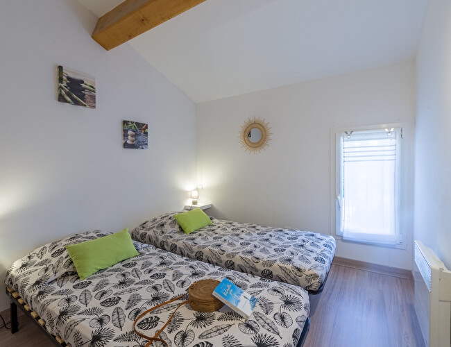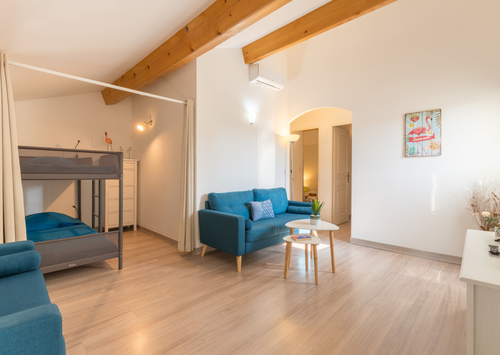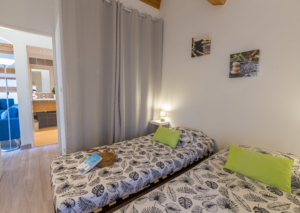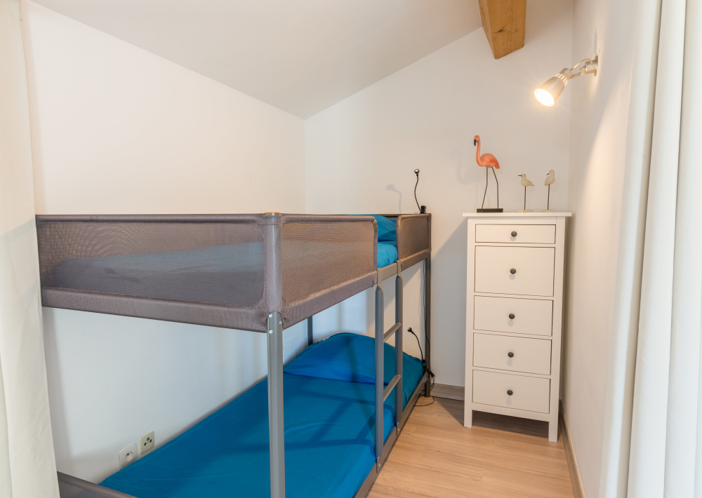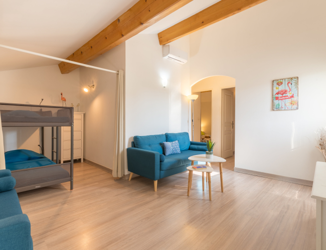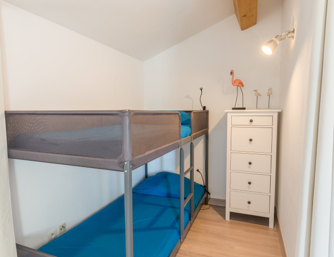 Vous y trouverez une chambre avec un lit double en 140, une deuxième chambre avec 2 lits simples en 80 et un coin nuit dans le salon avec un lit superposé (2 couchages).