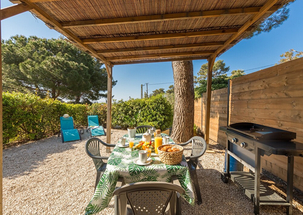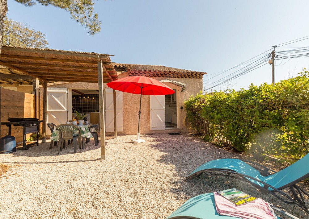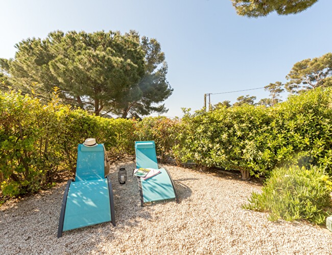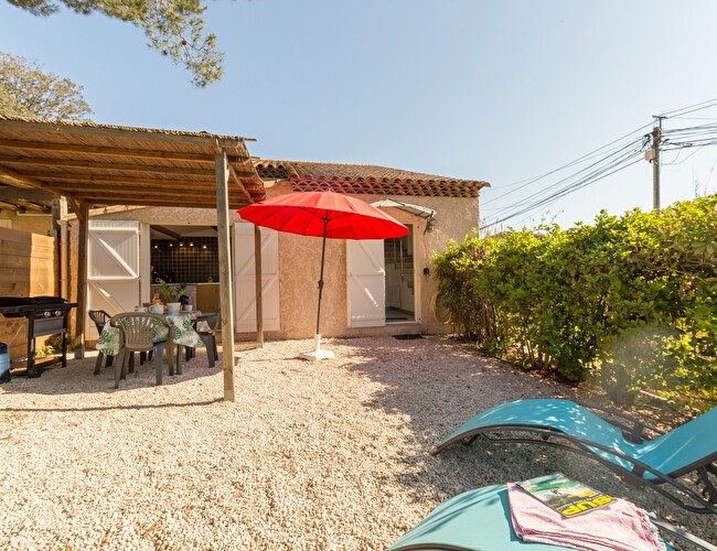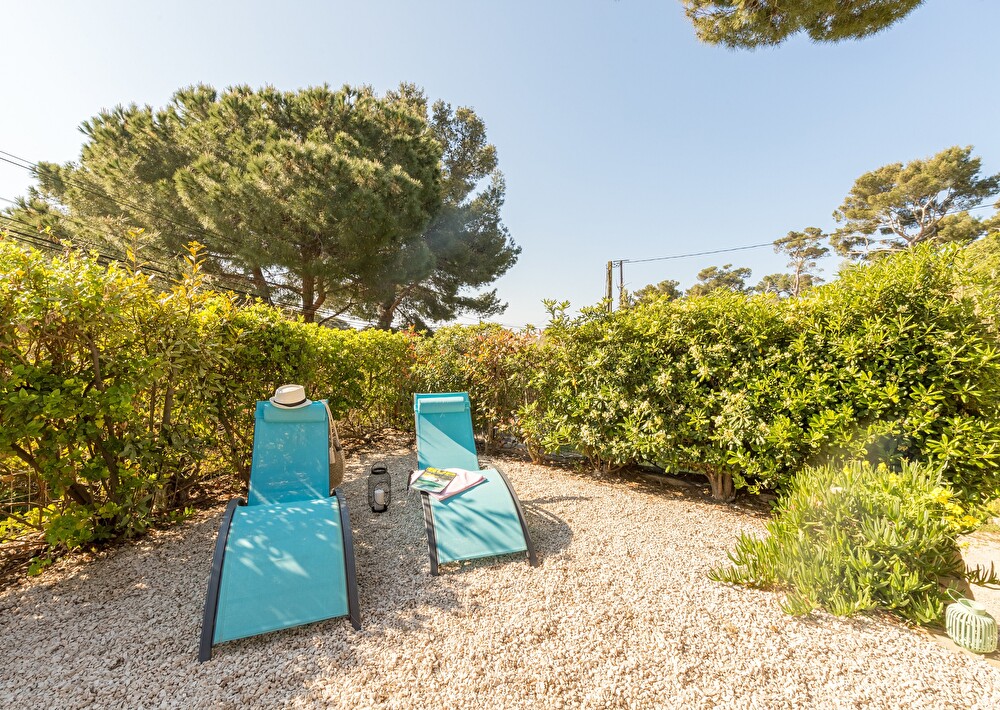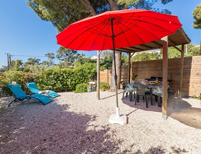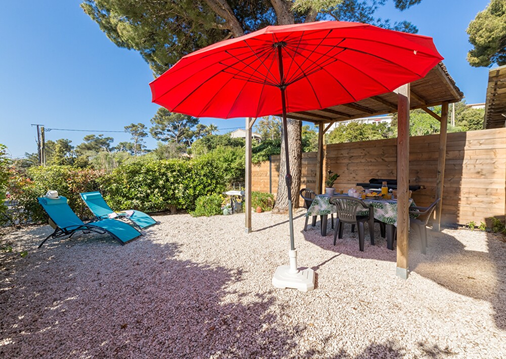 Jardin arboré exposition sud avec voile d'ombrage et aperçu mer, coin repas et plancha, 2 transats.