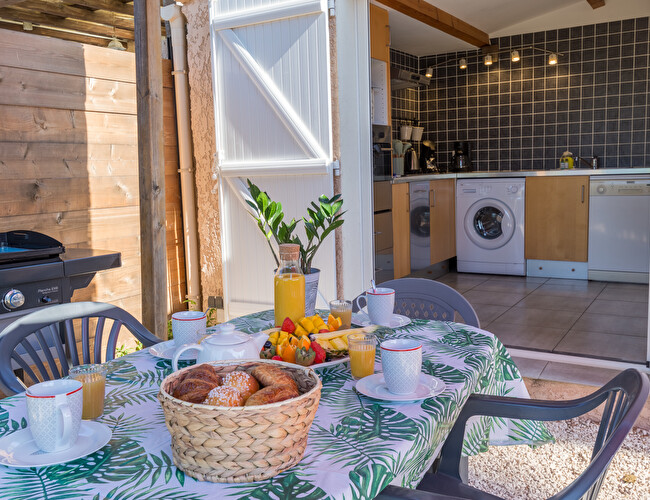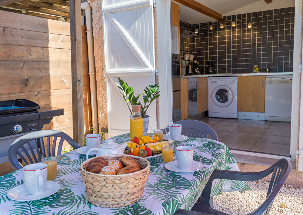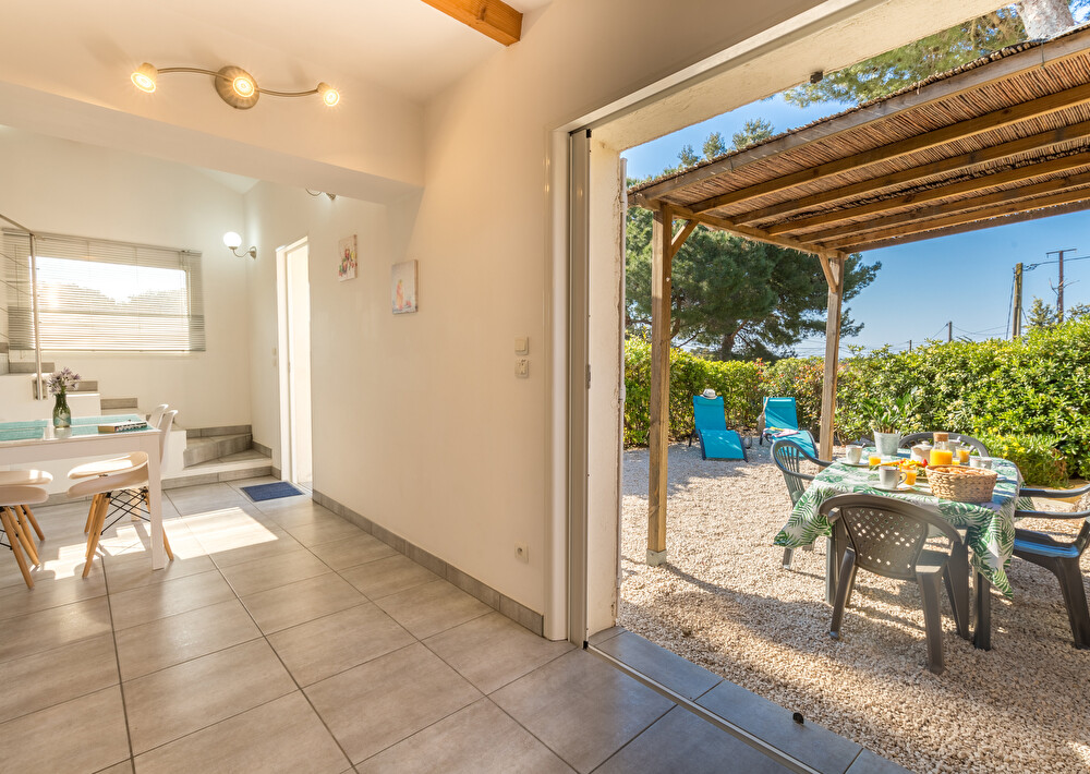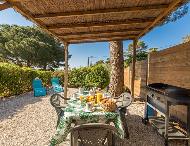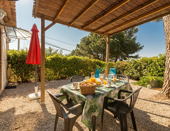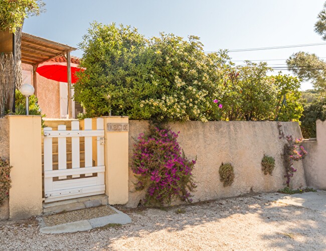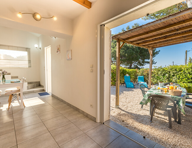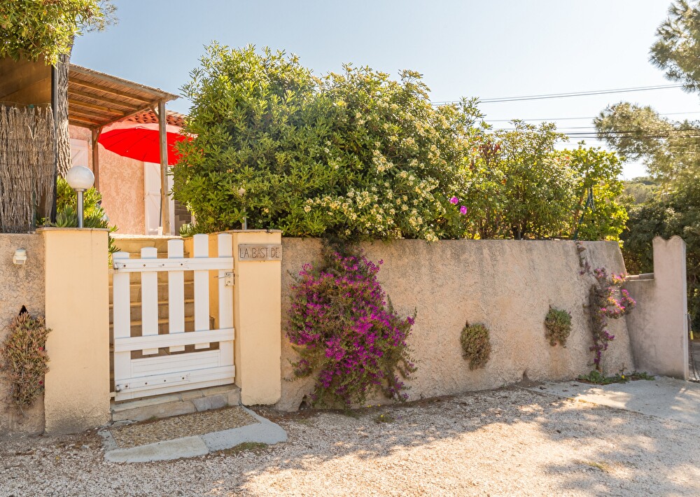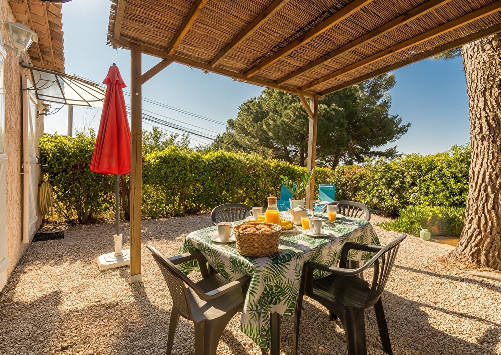 Jardin arboré exposition sud avec voile d'ombrage et aperçu mer, coin repas et plancha, 2 transats.