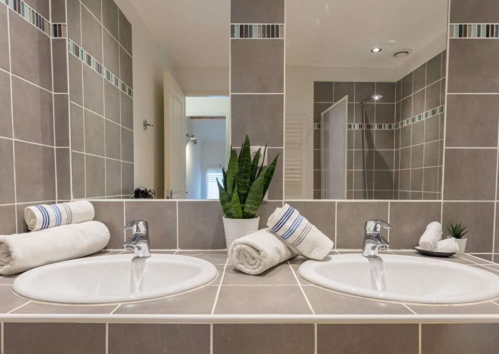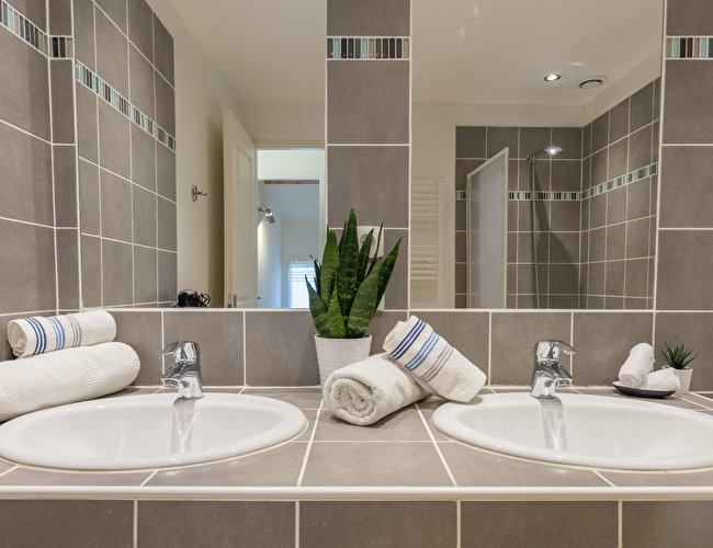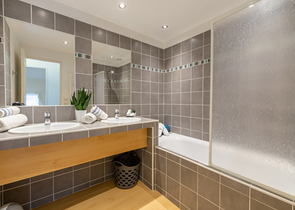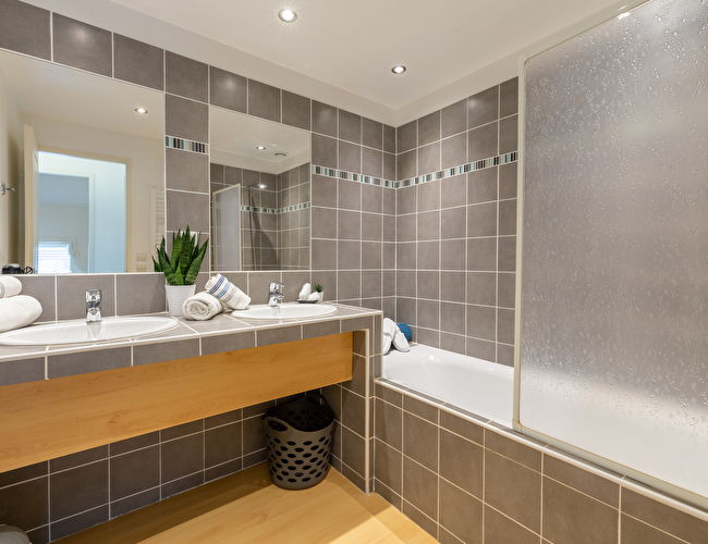 Une salle de bain avec double vasque et baignoire. Toilettes séparés.