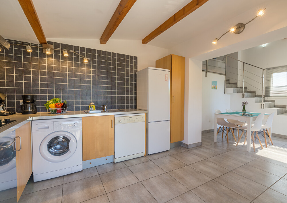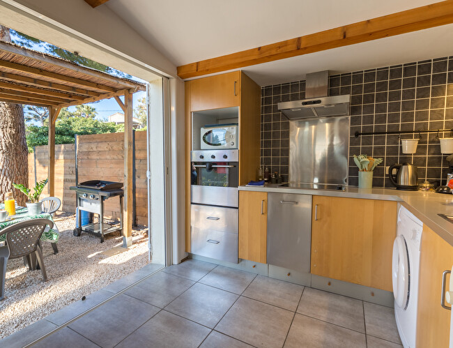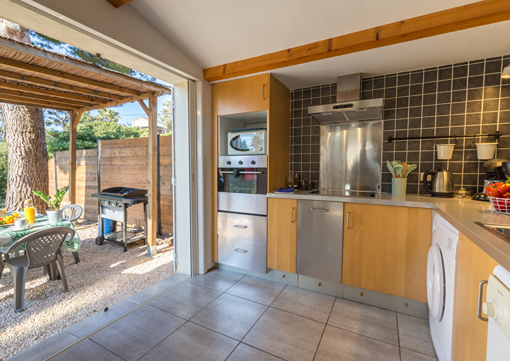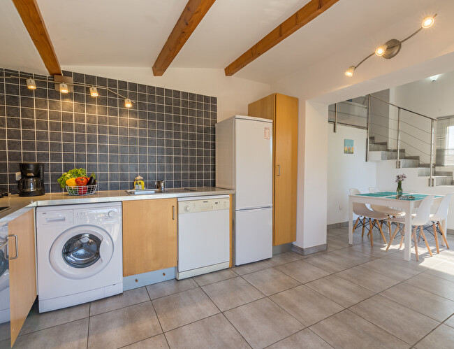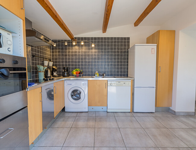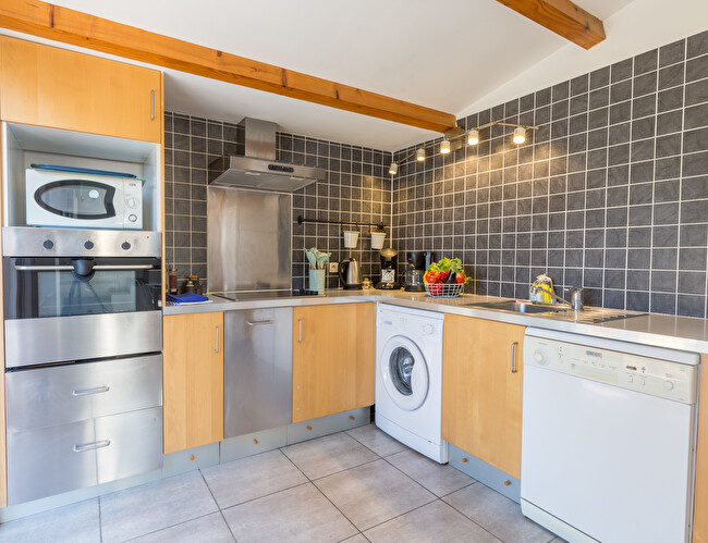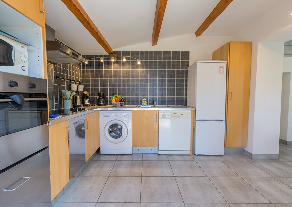 Cuisine entièrement équipée avec réfrigérateur, four, plaque de cuisson, cafetière classqiue, etc.