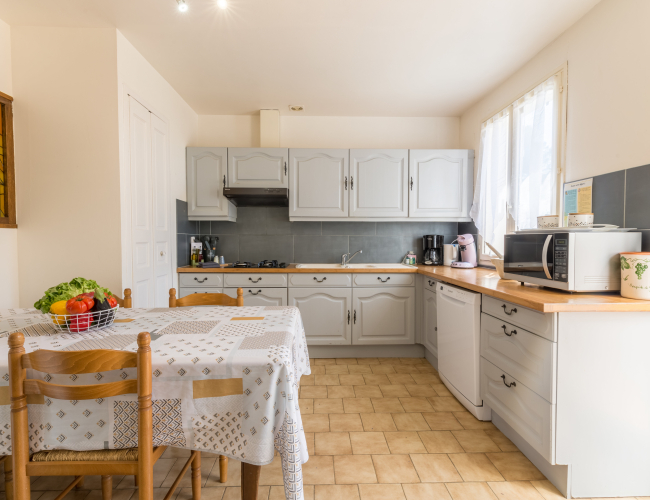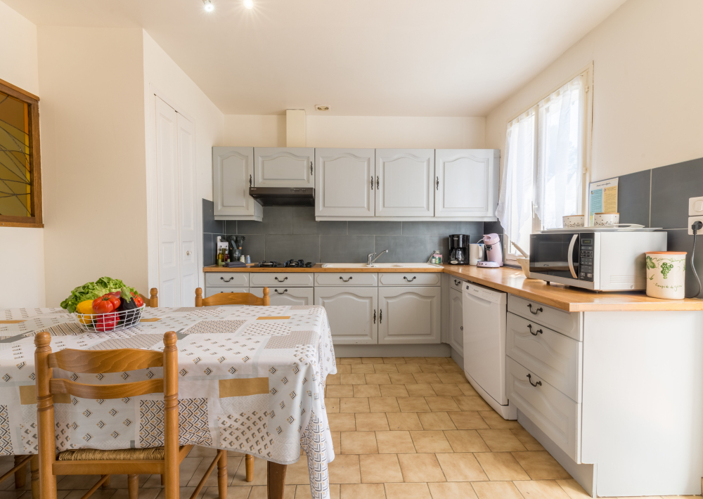 Cuisine entièrement équipée avec frigo américain, four, plaque de cuisson, cafetière classique, etc.
