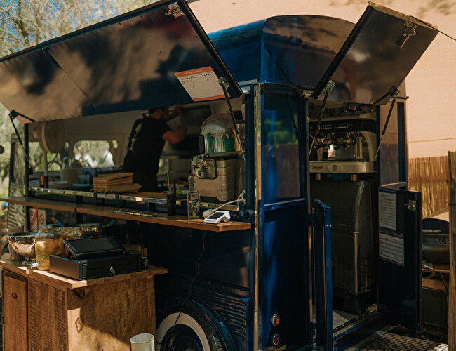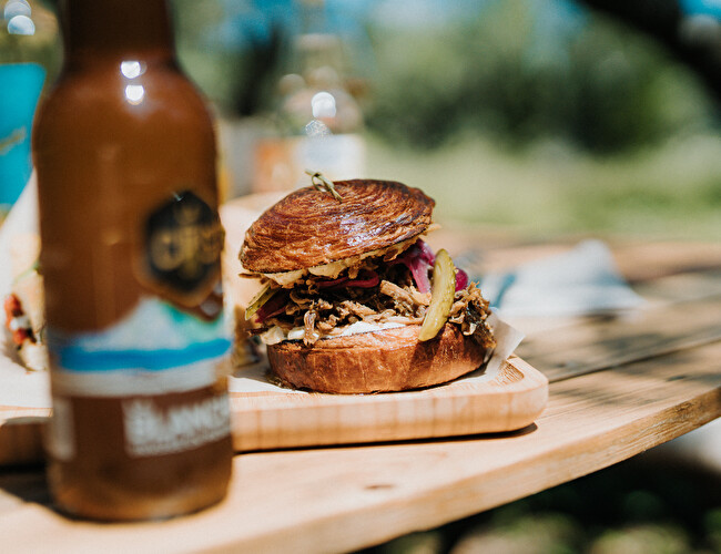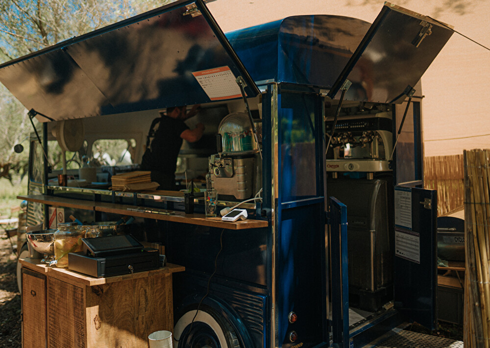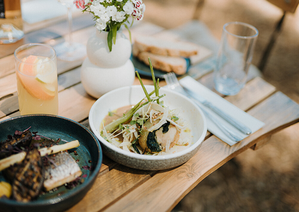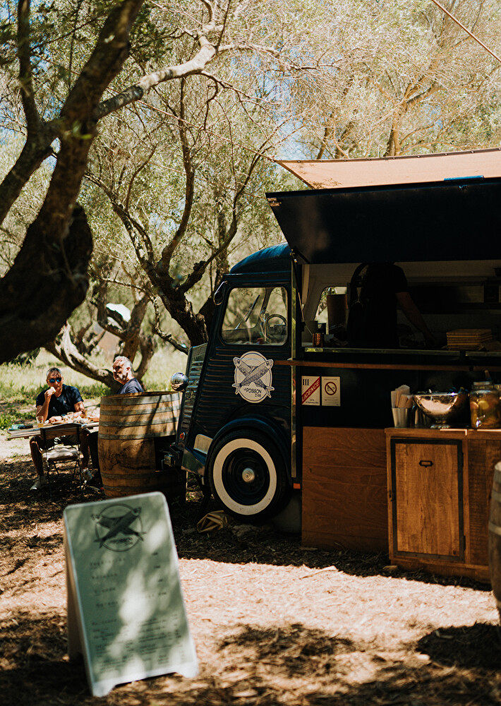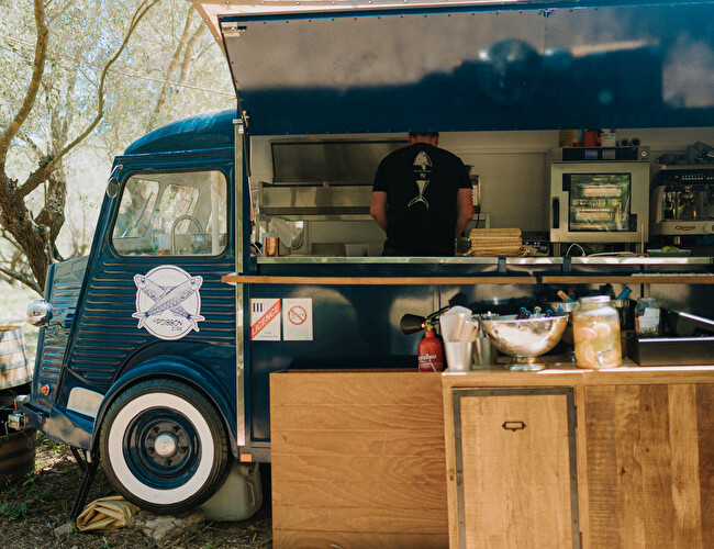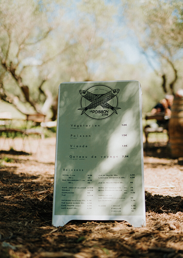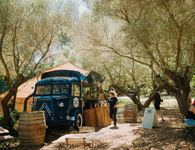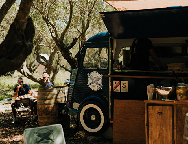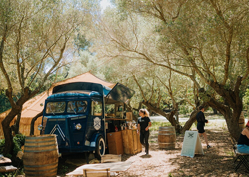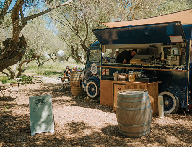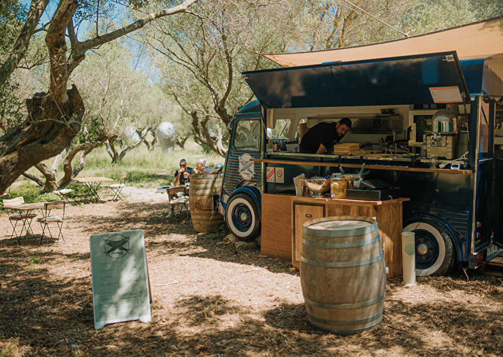 Parmi les oliviers, une offre de restauration légère est présentée par le Chef Hugo Mancel pour un déjeuner sur le pouce ou une pause après la visite de l’exposition.