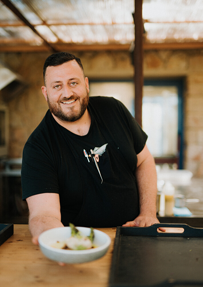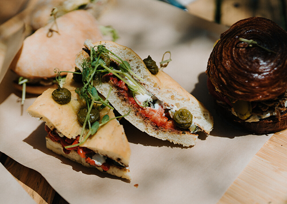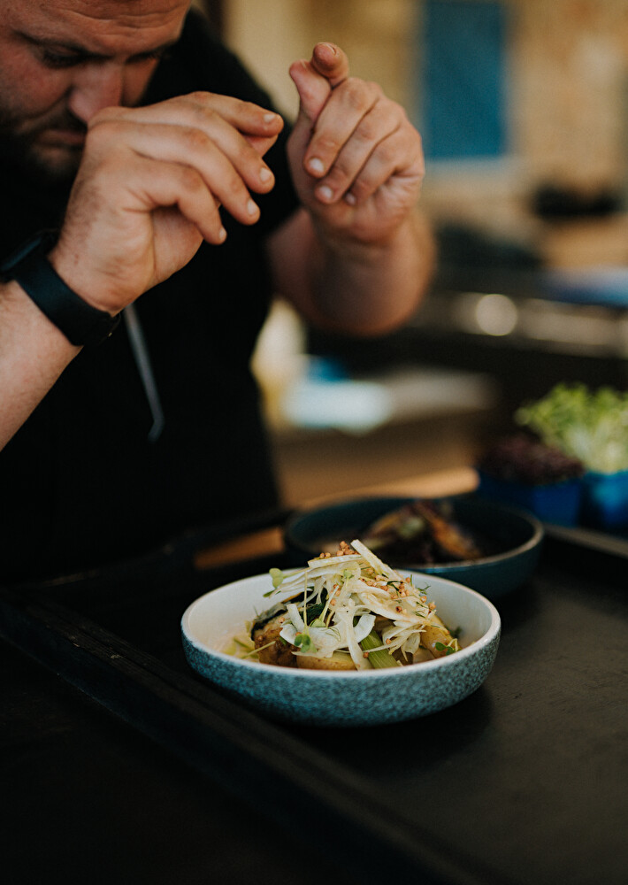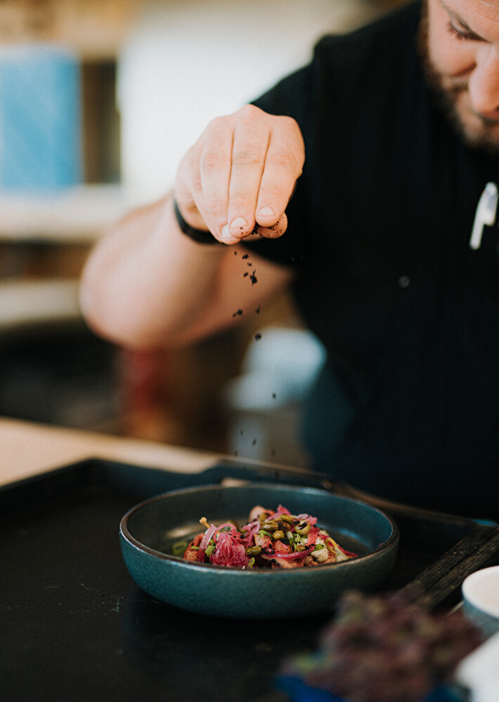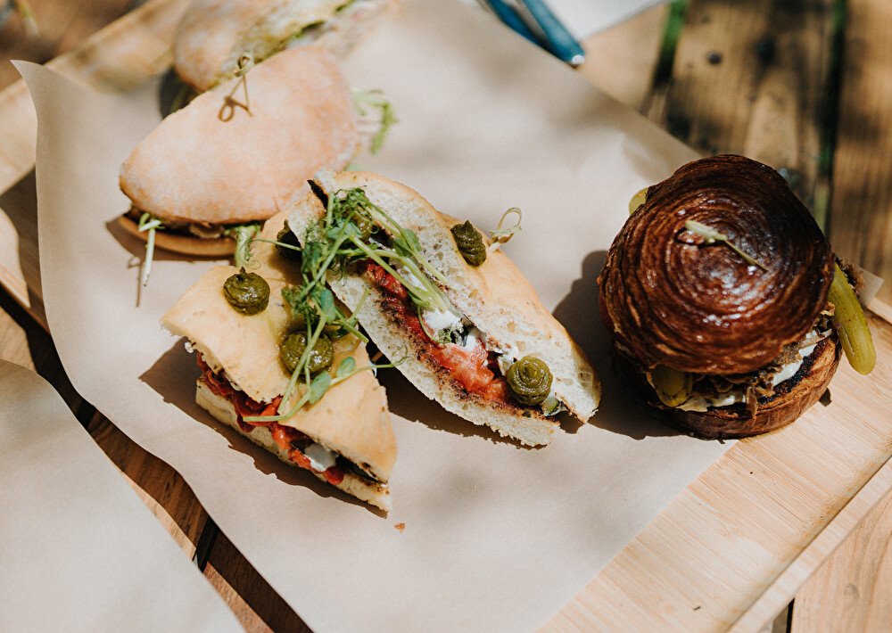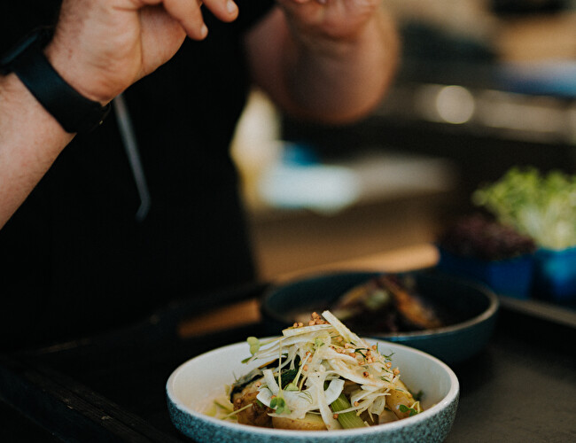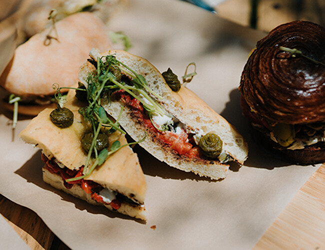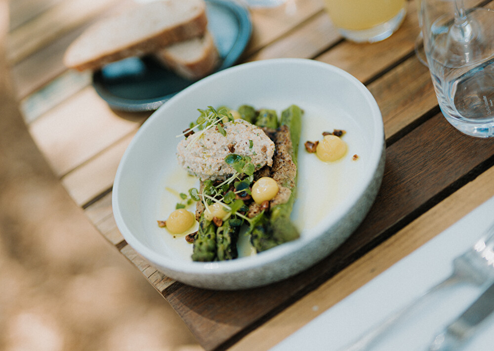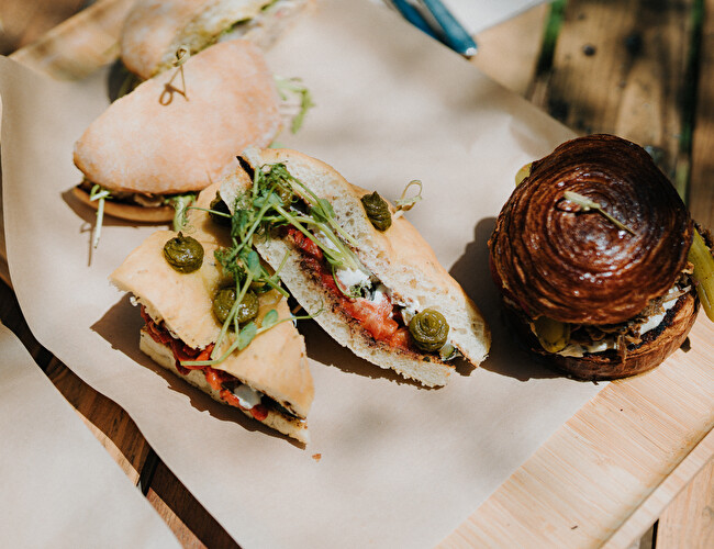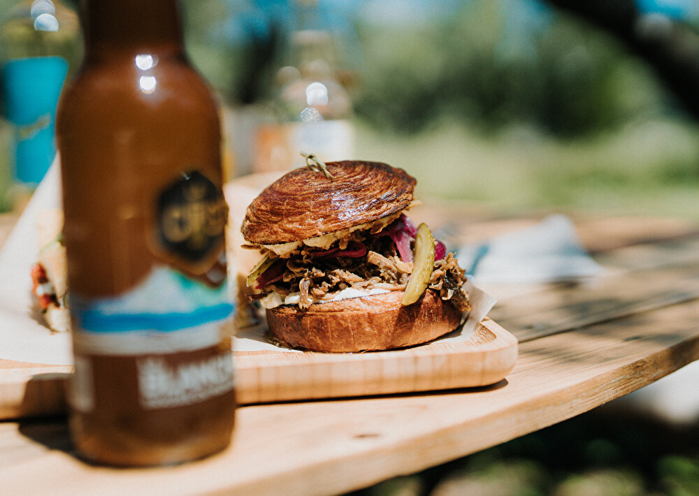 Parmi les oliviers, une offre de restauration légère est présentée par le Chef Hugo Mancel pour un déjeuner sur le pouce ou une pause après la visite de l’exposition.