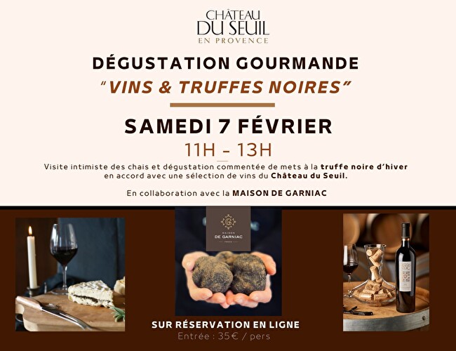 Au cœur de notre caveau, laissez-vous guider lors d’un atelier de dégustation où partage, découverte et plaisir des sens sont à l’honneur. Le menu se compose de cinq bouchées gourmandes à la truffe noire, imaginées pour sublimer et révéler les accords avec les vins du Château du Seuil. La Maison de Garniac sera présente pour vous faire partager la passion de son métier et de ses produits, dans une atmosphère conviviale et intimiste.