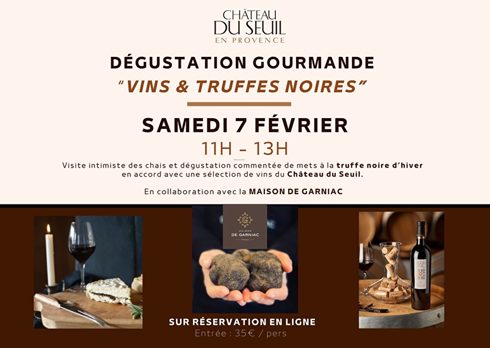 Au cœur de notre caveau, laissez-vous guider lors d’un atelier de dégustation où partage, découverte et plaisir des sens sont à l’honneur. Le menu se compose de cinq bouchées gourmandes à la truffe noire, imaginées pour sublimer et révéler les accords avec les vins du Château du Seuil. La Maison de Garniac sera présente pour vous faire partager la passion de son métier et de ses produits, dans une atmosphère conviviale et intimiste.