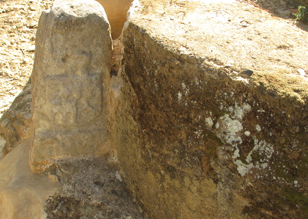 Sur la face opposée, le blason est identifié comme celui des Agoult-Pontevès, deux des plus anciennes et illustres familles nobiliaires de Provence, la seconde étant présente dans le Var dès la fin du Xème siècle. Leur union est scellée en 1213 mais l'origine des armes héraldiques de la famille Agoult-Pontevès remonte à 1251 lorsque Foulques 1er, leur 6ème enfant, en hérite et prend leur nom. La présence de ces seigneurs dans la région d'Hyères est attestée au moins depuis la fin du XVème siècle sur les vestiges du château de Giens (Hyères), marquant le territoire de cette seigneurie jusqu'en 1691 et d'un marquisat jusqu'en 1832. La datation de la borne couvre donc une large période !