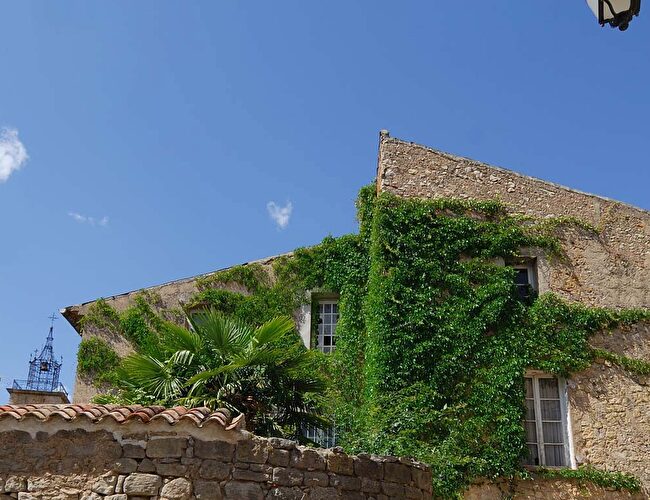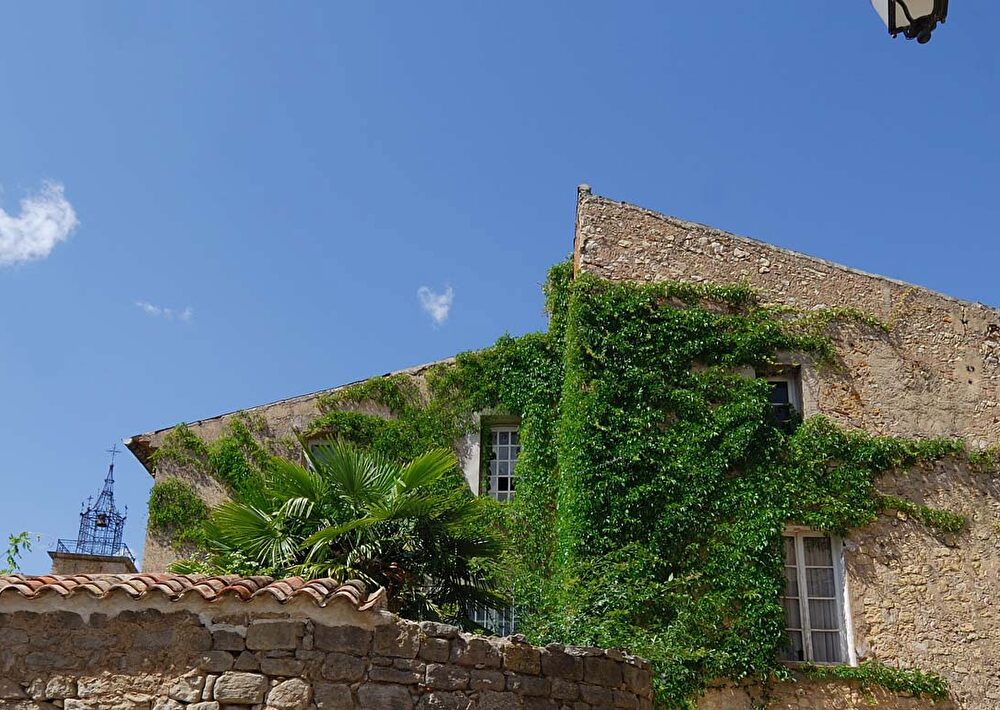 Tout autour se groupent des toitures de tuiles rose tendre. Et plus loin, une ligne sinueuse de verdure indique la rivière. C’est un damier de vignobles, d'oliveraies et de jardins, ponctué de vieilles bastides.