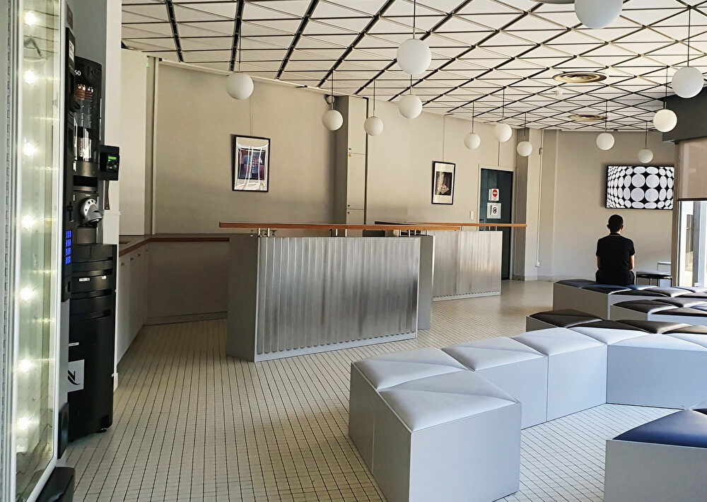 Prenez le temps d'une pause dans l'espace cafétéria. Autour du comptoir dessiné par Victor Vasarely, offrez-vous un café, un encas ou un rafraîchissement. Pour compléter votre visite, des films d'archives sur la vie et l'œuvre de Victor Vasarely vous accompagnent dans cet espace.