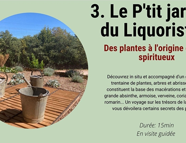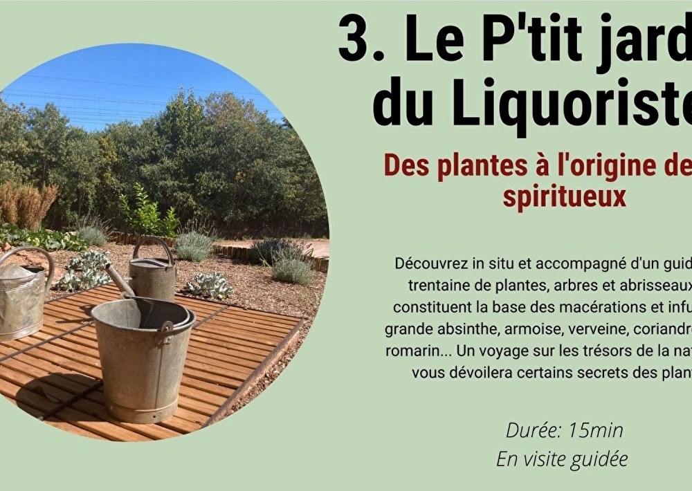 Découvrez in situ et accompagné d’un guide, une trentaine de plantes, arbrisseaux et arbres qui constituent la base des macérations et infusions : grande absinthe, armoise, verveine, baies de genièvre, coriandre, citron, thym, romarin... Un voyage rempli d’anecdotes sur les trésors de la nature qui vous dévoilera certains secrets des plantes.