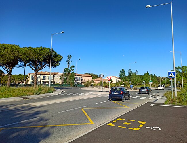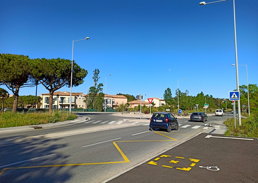 • au second rond-point, continuez tout droit en passant devant les commerces des Marines de Gassin (Bar-tabac des Marines, Tour de Pizz', Ciao Belli ; vous trouverez sur la place Le Pitchoun, Sandrée Coiffure, la laverie May Flower) ;
